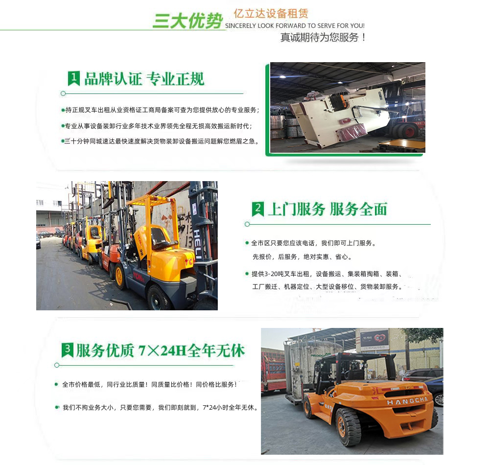 亿立达设备租赁有限公司是工商局准许的天津农学院专业叉车出租公司,公司本着诚信、服务、效率、创新的经营理念,用精湛的技术,真诚的服务,为众多客户提供优质的服务,同时获得信赖与支持。专业提供天津农学院3-20吨叉车出租、叉车租赁、设备搬运、集装箱掏箱装箱、机器移位定位、货物装卸、工厂搬迁、安全可靠,收费透明,价格便宜,随叫随到,24小时上门服务!本公司叉车吊车师傅对各种设备搬运装卸都有深刻探讨和研究。很多的疑难设备搬运,通过我公司的叉车师傅都能迎刃而解。对各种进口设备、国产机器、大型设备搬迁、高难度搬迁、各种精密仪器、医疗设备、科研设备等都能搬运; 提供全市 24 小时上门装卸搬运服务。同时提供厂房搬迁服务。 ...